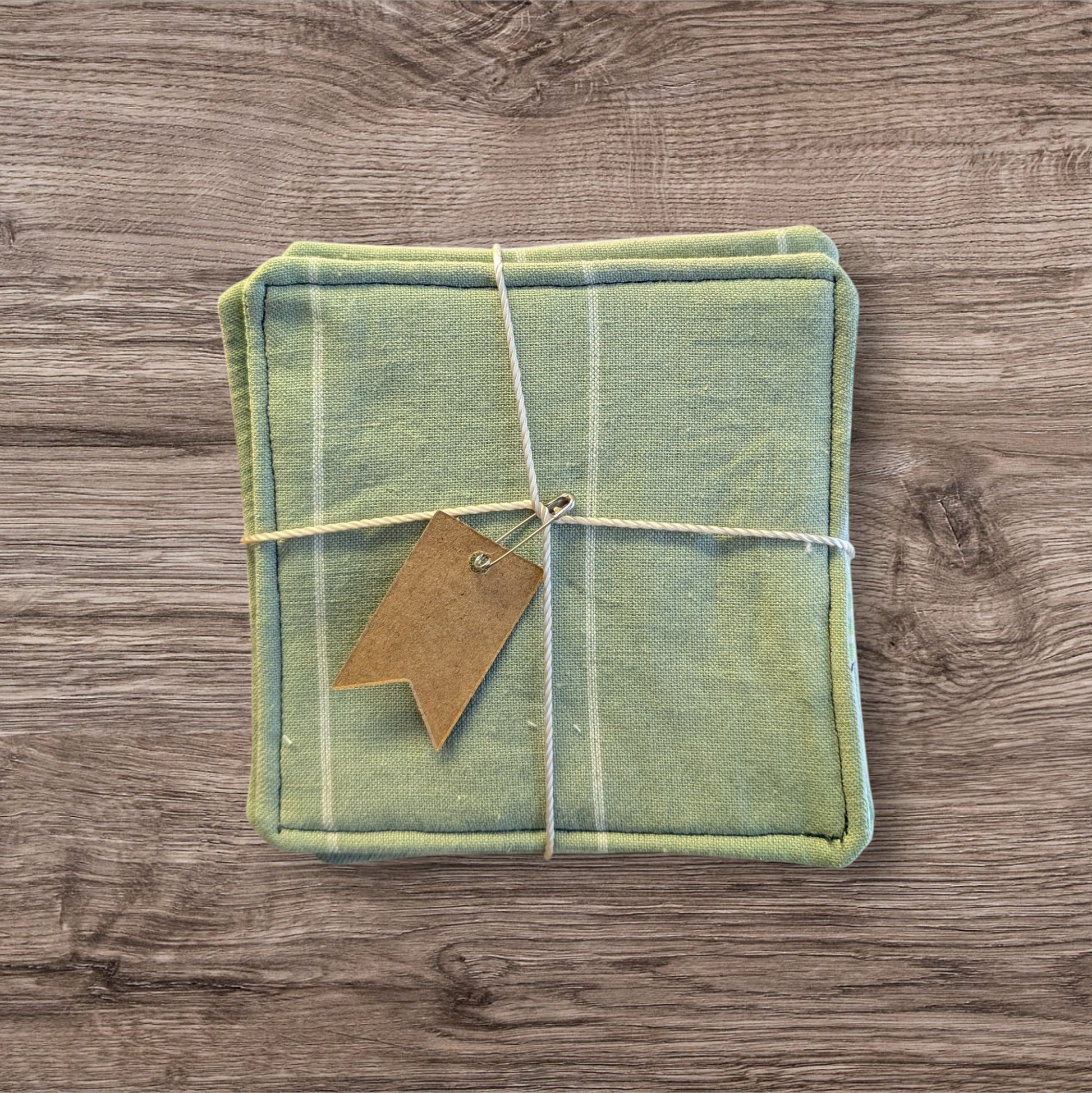 Create a product description for coasters that are hand made with a linen cotton fabric. They are a light muted green with off-white stripes. They come in sets of four to have a polka. Background and two are solid off-white.