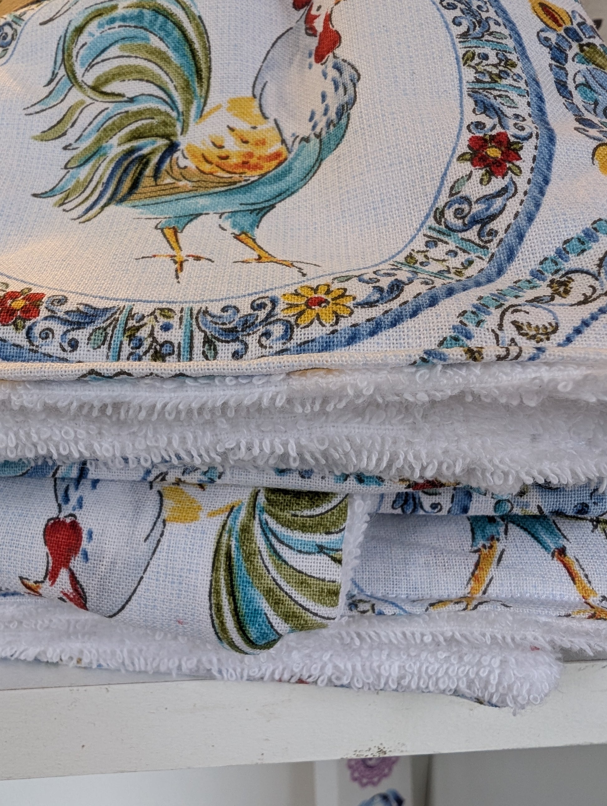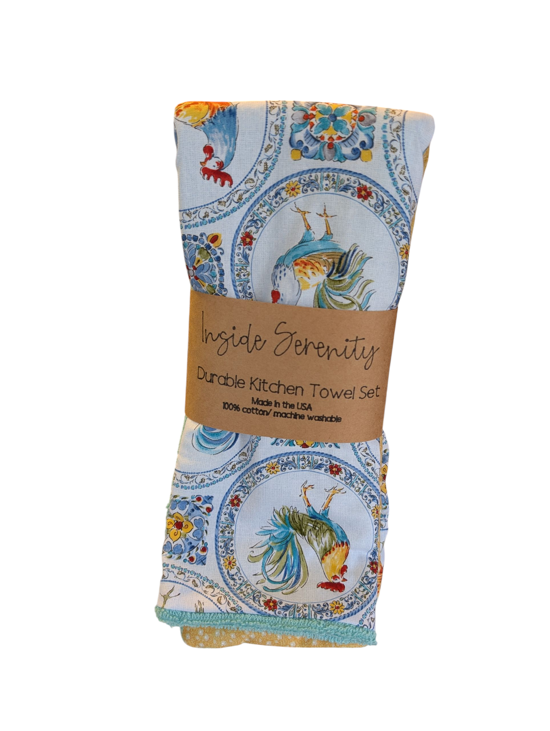These long lasting quality kitchen towels are handmade to be both durable and stylish! There is fashionable cotton fabric on one side and terry cloth on the other side allowing for actual long lasting kitchen use. These kitchen towels have stitching that is reinforced creating a thick and heavy duty towel. This is a set of two matching towels measuring approximately 23″ x 14.5″.